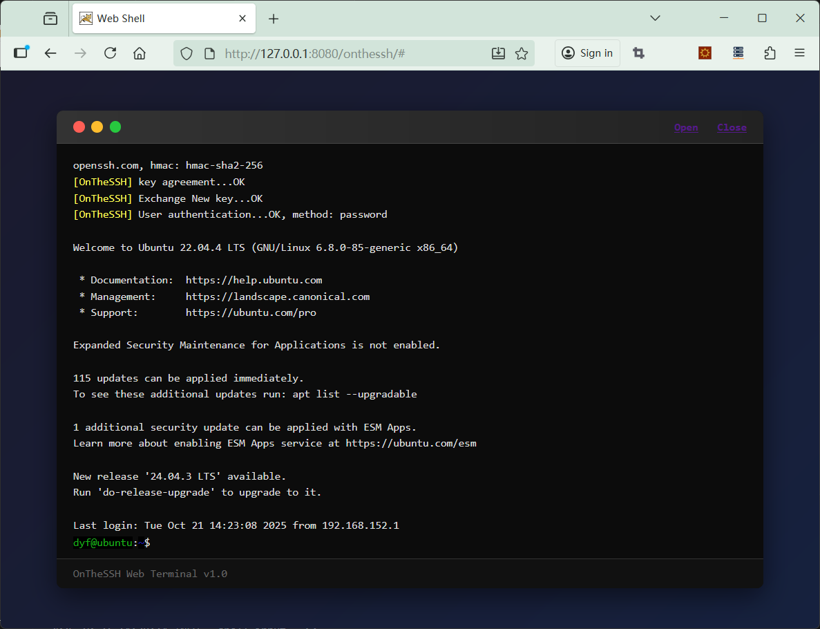 For simplicity and educational purposes, the Web shell terminal window of index.html only implements the most basic functions. Compared with the OnTheSSH App, it lacks extended functions such as copy and paste, color and style switching, input method input, and command help. In practical application, You can refer to the source code of OnTheSSH (Qt/C++ part) to implement these extended functions.